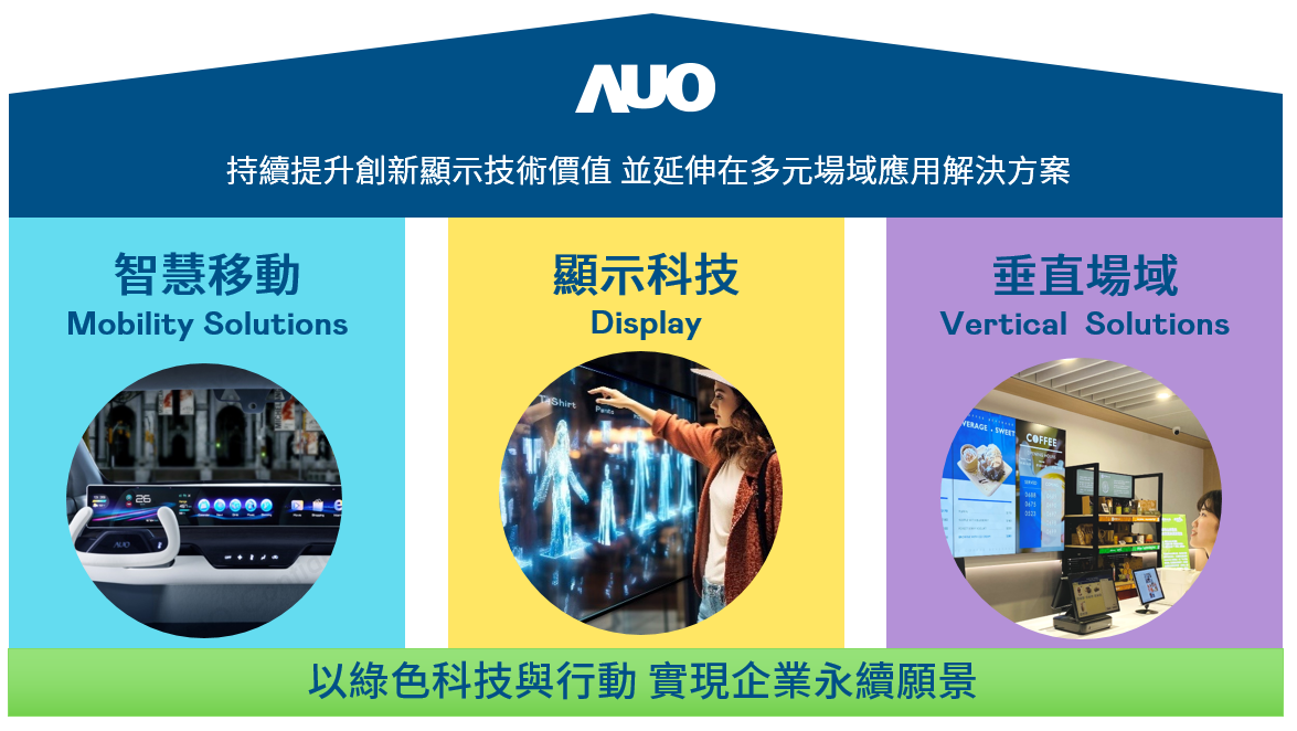 我們持續推動「雙軸轉型」,在精進顯示技術附加價值(Go Premium),與深化垂直市場應用(Go Vertical)的策略下,對應爱游戏官网的優勢競爭力與趨勢,我們奠定顯示技術、智慧移動、垂直場域三大永續營運支柱,在顯示技術領域的根基之上,延伸布局多元場域應用解決方案。將先進顯示科技助力智慧移動及垂直場域發展,並以綠色科技與行動為實踐,在轉型之路上貫徹永續經營之願景。